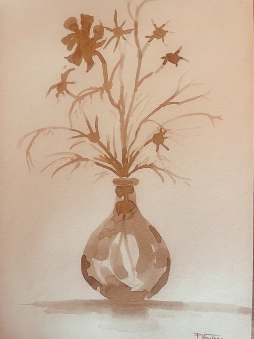 Painting, monochrome sepia still life "dried flowers", signedPainting, monochrome sepia still life "dried flowers", signed