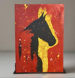 Contemporary abstract artwork in blue, red,black, yelow on stretched canvas