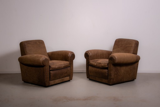 Mickey Armchairs by Baxter Italy in Nabuk Camel Leather. Circa 1998