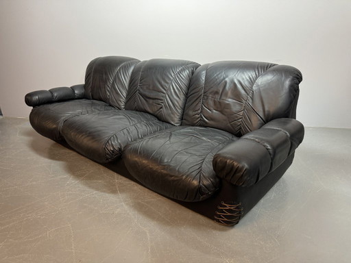 Beautiful Big Black Leather Postmodern Italian Design Space Age 3-Seat Lounge Sofa with Brass Buttons and Playful Cord Lacing
