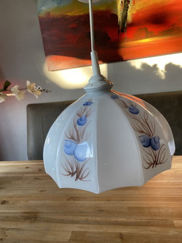 Vintage Opalglas Pendelleuchte mit handbemaltem BlumenmusterVintage Opalglas Pendelleuchte mit handbemaltem Blumenmuster