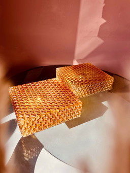 Hängeleuchte aus floralem Vintage-Glas in strukturierter rosa Pastellfarbe. Teilweise transparent.