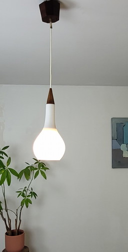 Große Vintage Design Drop Pendelleuchte aus Opalglas und TeakholzGroße Vintage Design Drop Pendelleuchte aus Opalglas und Teakholz
