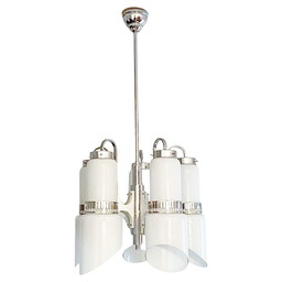 Modernistischer Kronleuchter, verchromtes Metall Opalines, Frankreich Mitte des Jahrhunderts - 8 Leuchten