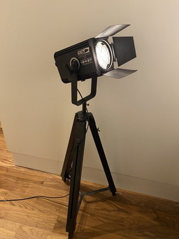 Industrieller Theaterscheinwerfer auf verstellbarem Holzstativ - dimmbare Led