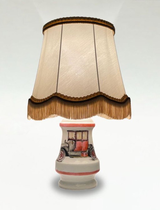 Vintage Tischlampe mit rosa Schirm und leuchtendem Knopf