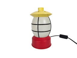 Rote und silberne Tischleuchte aus Kunststoff, hergestellt in Italien. Durchmesser 28 cm, Höhe 14 cm.