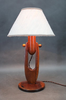Lampe aus Vintage-Holz mit weißem Kunstlederschirm