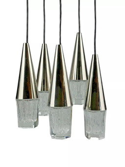 60er 70er Jahre Hängelampe Kaskadenlampe 5-flammig Glas & Chrom Space Age Design60er 70er Jahre Hängelampe Kaskadenlampe 5-flammig Glas & Chrom Space Age Design