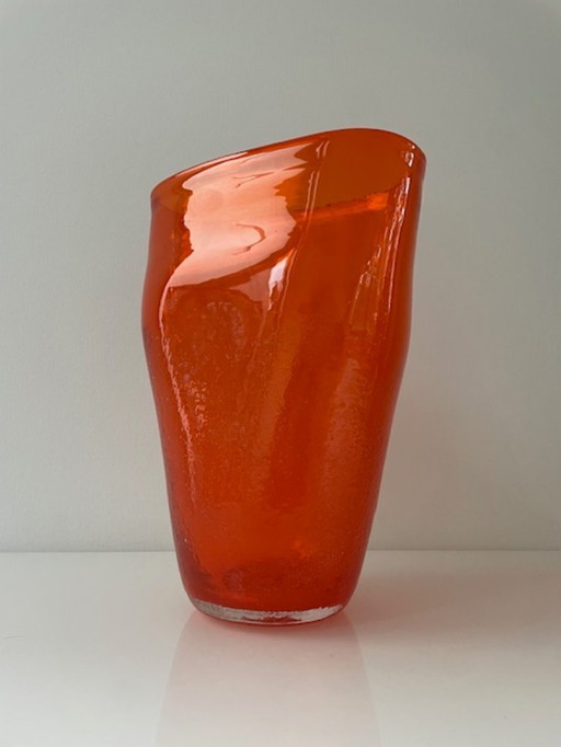 Handgefertigte, mundgeblasene Vase aus intensivem orangefarbenem GlasHandgefertigte, mundgeblasene Vase aus intensivem orangefarbenem Glas