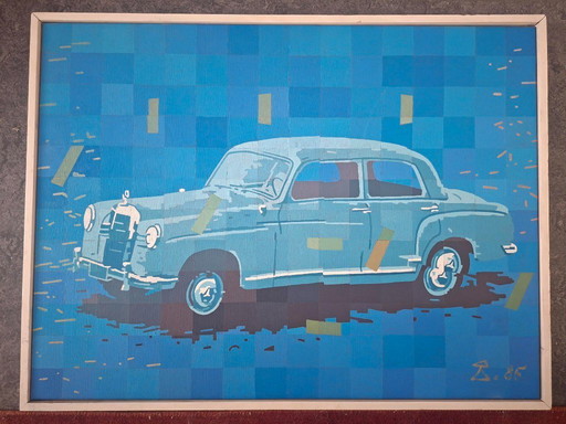 Gemälde auf Holz mit Linoleumdruck, signiert