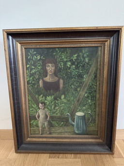 Naives modernistisches Gemälde „Laundry Day“, Öl auf Holz von Eskil Skans