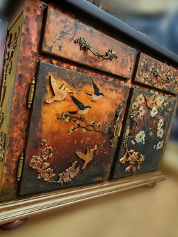 Vintage-Kommode mit geschwungenem Profil und handbemalten Golddetails