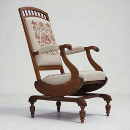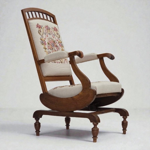 Holzschaukelstuhl aus der viktorianischen Ära des späten 19. Jahrhunderts mit originalem floralem Bezug.