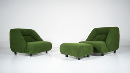 Zeitgenössisches Sesselpaar mit Ottomane, grüne Polsterung, Italien