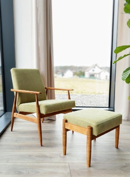 Vintage-Sessel- und Fußhocker-Set aus olivgrünem Cord, Design von H.Lis