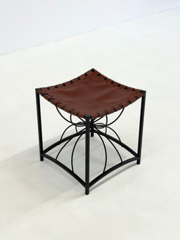 Eleganter französischer Vintage-Hocker mit schwarzem Metall und braunem Leder