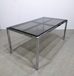 Abgerundeter rechteckiger Vintage-Esstisch im Space Age-Stil der 70er Jahre aus Rauchglas und verchromtem Metall