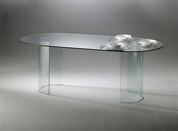 Esstisch aus Glas im Stil „Leon Rosen“ mit facettierter Kante.Esstisch aus Glas im Stil „Leon Rosen“ mit facettierter Kante.