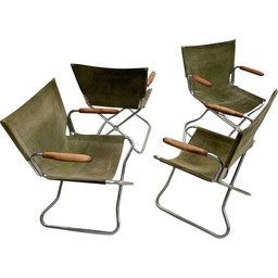 Satz von 4 Klappsesseln aus Holz und grünem Leinen aus der Mitte des Jahrhunderts