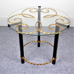 Schwarz-goldener Metall-Sockeltisch mit Glasplatte, 1950