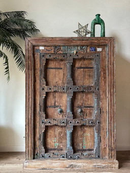 Antiker indischer Türschrank mit handgeschnitzten Türen – einzigartiger Holzschrank / repräsentatives Einzelstück (213 cm)