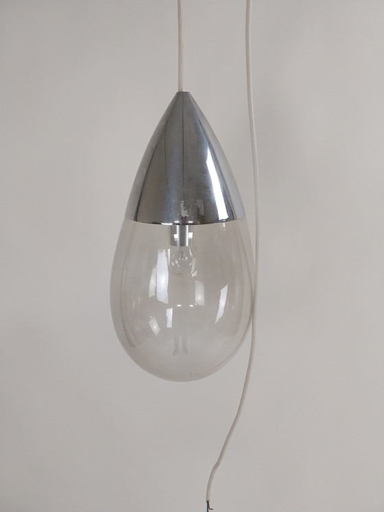 Diese wunderschöne Glashütte Limburg Pendelleuchte aus den 1970er Jahren ist ein Musterbeispiel an Eleganz und Handwerkskunst. Das tropfenförmige Design, kombiniert mit dem transparenten Glasschirm und dem glänzenden Metallgestell, macht diese Lampe zu einer zeitlosen Ergänzung für jedes Interieur.