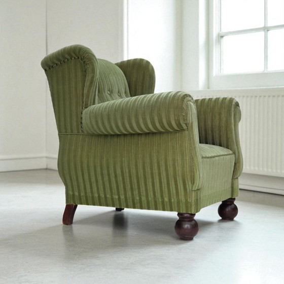1950er Jahre, dänischer Relaxsessel, grüner Möbelveloursstoff, Beine aus Eschenholz.
