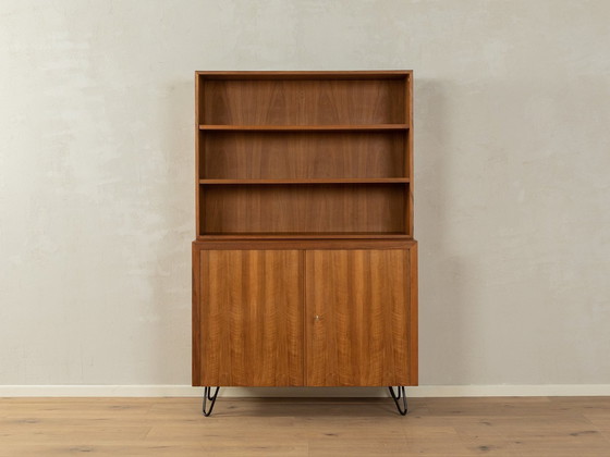 Klassischer zweiteiliger Schrank aus den 1950er Jahren. Korpus in Nussbaumfurnier mit zwei Türen, drei Einlegeböden und neuen zeitgenössischen Haarnadelbeinen in Schwarz. Qualitätsmerkmale: sehr gute Verarbeitung hochwertige Materialien Korpus mit Massivholzkanten Made in Germany, Hersteller: Musterring REF: 904110
