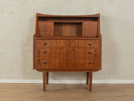 Klassische Kommode aus den 1960er Jahren. Korpus in Nussbaumfurnier mit ausziehbarer Arbeitsfläche, drei kleinen und drei großen Schubladen, einer Tür, einem Einlegeboden und schrägen Füßen. Sehr gute Verarbeitung, hochwertige Materialien, Schubladen aus Massivholz mit Schlitz und Zapfen. Hergestellt in Dänemark.