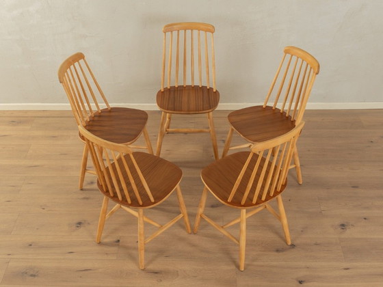 Seltene Esszimmerstühle im Stil von Ilmari Tapiovaara aus den 1960er Jahren. Hochwertiges Gestell aus massivem Eschenholz mit einer Sitzfläche aus Teakholzfurnier. Das Set besteht aus 5 Stühlen. Hergestellt in Dänemark.