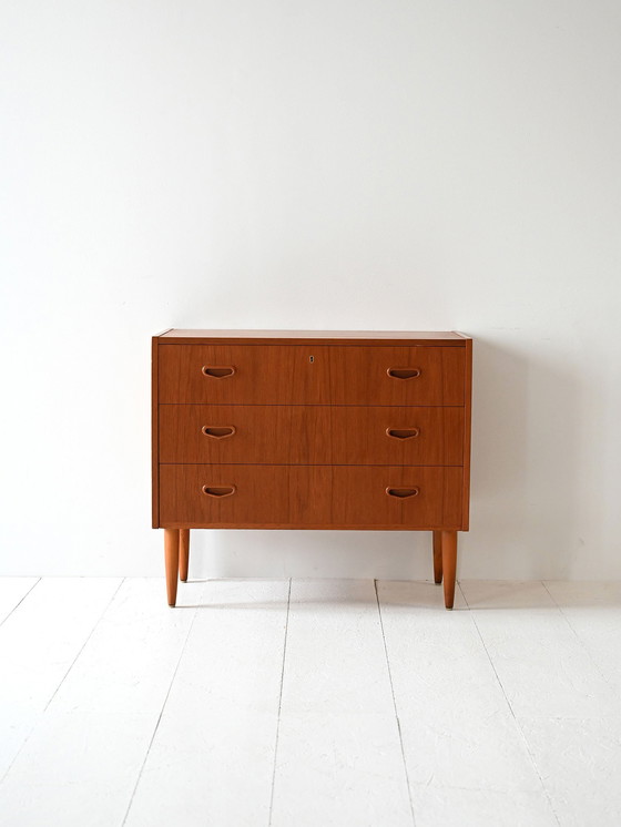 Schlichte Eleganz kennzeichnet diese skandinavische Kommode aus Teakholz aus den 1960er Jahren mit drei geräumigen Schubladen und sanft gerundeten, geschnitzten Griffen. Die konisch zulaufenden Beine und der kompakte Rahmen spiegeln die praktische Einfachheit des nordischen Modernismus wider. Das warme Holzfinish unterstreicht die klaren Linien.