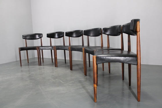 1960er Satz von sechs hölzernen Esszimmerstühlen mit schwarzem Kunstlederbezug, Dänemark