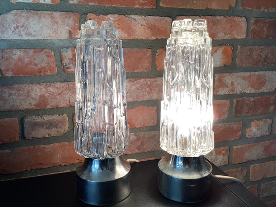 1960er Set von 2 Rock Ice Glas Tischlampen, Chromsockel, deutsch Mid Century