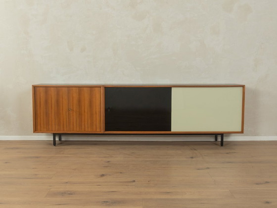 Klassisches Sideboard aus den 1960er Jahren von Lothar Wegner. Hochwertiger Korpus in Nussbaumfurnier mit zwei Glasschiebetüren in Schwarz und Cremeweiß, zwei Türen, zwei Einlegeböden und neuen Vierkantstahlfüßen in Schwarz. Die Platte ist mit schwarzem Formica beschichtet. Durchdachtes Design mit perfekten Proportionen und sichtbarer Liebe zum Detail. Hochwertige Verarbeitung mit erstklassigen Materialien. Hergestellt in Deutschland von Lothar Wegner.