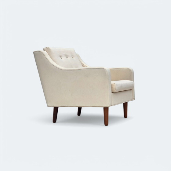 Dänischer Loungesessel aus den 1970er Jahren. Beige/weiße Möbelwolle, Beine aus Teakholz. Der Stuhl wurde vor etwa 15 Jahren von einem Handwerker neu gepolstert. Hergestellt von einem dänischen Möbelhersteller um 1970-75. Sehr guter Zustand: keine Gerüche, keine Flecken, und stabile Konstruktion. Original skandinavische Handwerkskunst Vintage-Design direkt aus Dänemark. Der Stuhl wurde von einem Handwerker geprüft.