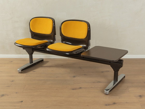 Klassische Wartebank aus den 1970er Jahren. Hochwertiges Stahl- und Edelstahlgestell mit zwei Kunststoff-Sitzschalen in Braun und einer Tischplatte mit original HPL-Beschichtung und Kunststoffkante in Braun. Die Sitzschalen wurden neu gepolstert und mit einem hochwertigen Polsterstoff in Senfgelb bezogen. Ref 2501008