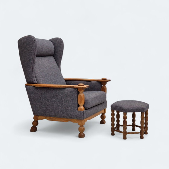 1970er Hochlehner dänischer Sessel mit Fußhocker, Möbel Wollstoff, Eichenholz massiv