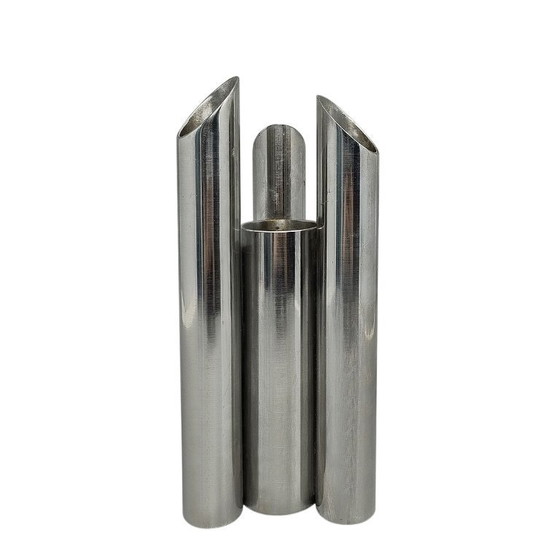 1970er Jahre Erstaunliche Space Age Vase mit 4 asymmetrischen Röhren in verschiedenen Höhen aus Edelstahl. Hergestellt in Italien. Diese Vase ist in ausgezeichnetem Zustand.