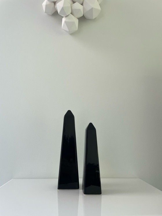 Dieser Satz von zwei Keramik-Obelisken aus den 1980er Jahren ist ein beeindruckendes Beispiel für den Memphis-Stil. Die klaren, geometrischen Formen und die glänzende schwarze Oberfläche machen sie zu einem auffälligen Sammlerstück. Hergestellt aus Keramik, hat der kleinste Obelisk einen sehr kleinen Chip.