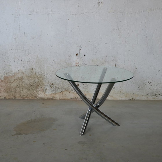 Ein eleganter und moderner Couchtisch mit drei Beinen, perfekt für ein zeitgemäßes Wohnzimmer. Die Glasplatte sorgt für einen schlichten und minimalistischen Look, während das Chromgestell einen Hauch von Eleganz verleiht. Ideal zum Präsentieren von Büchern oder Deko-Objekten.