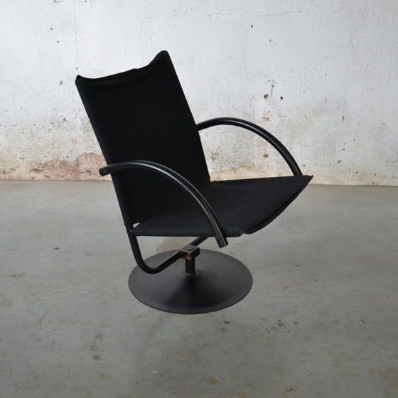 Dieser ikonische, von Karel Boonzaaijer und Pierre Mazairac entworfene und von Hennie de Jong International Collections produzierte Drehsessel aus Segeltuch verkörpert die klaren Linien und die Funktionalität der 1980er-Jahre. Mit seinem schwarzen Segeltuchbezug und dem Metallgestell verleiht er jedem Raum einen Hauch von Vintage-Design.