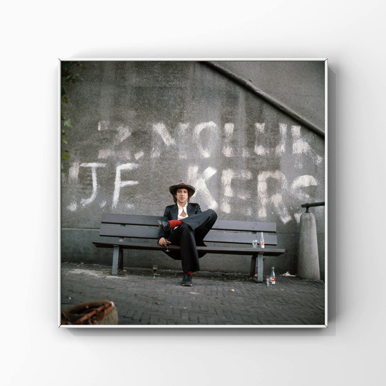 Ein eindrucksvolles Porträt des niederländischen Sängers und Schauspielers Ramses Shaffy (1933–2009), sitzend auf einer Parkbank. Das Foto zeigt Shaffy in einem stillen, nachdenklichen Moment und fängt die raue, urbane Atmosphäre Amsterdams der 1960er-Jahre ein. Ein Bild, das Persönlichkeit, Zeitgeist und dokumentarische Kraft vereint.