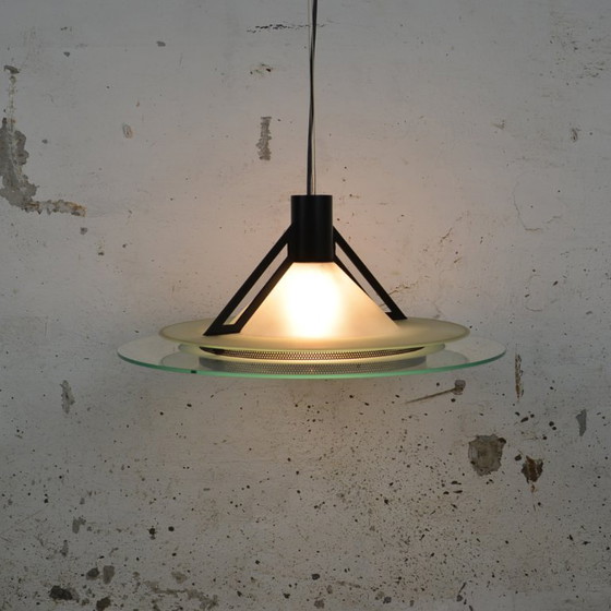 Diese Memphis-Pendelleuchte aus den 1980er-Jahren vereint kühnes Design mit funktionaler Beleuchtung. Die Leuchte besticht durch ihr markantes Design mit einem Gestell aus Glas und Metall in elegantem Schwarz. Ein Muss für Retro- und Designliebhaber – diese Leuchte verleiht jedem Raum eine besondere Note.