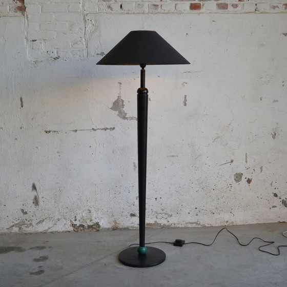 Diese Memphis-Stehlampe aus den 1990er-Jahren ist ein echter Hingucker, der jedem Raum Stil und Funktionalität verleiht. Mit ihrem eleganten schwarz-grünen Design und den hochwertigen Materialien wie Holz und Stoff fügt sie sich perfekt in moderne Einrichtungen ein. Die Lampe ist mit einer 118-mm-Halogenlampe ausgestattet, die für warmes und einladendes Licht sorgt. Verleihen Sie Ihrem Zuhause mit dieser einzigartigen Stehlampe einen Hauch von Retro-Charme.