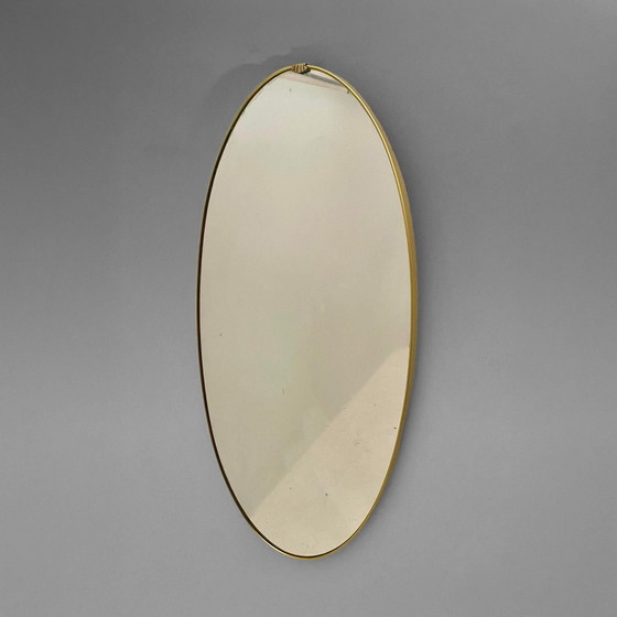 Dieser ovale Vintage-Spiegel aus Messing, der in den 1950er Jahren in Italien hergestellt wurde, strahlt zeitlose Eleganz und einen raffinierten Charme aus, der an den Stil des großen Gio Ponti erinnert. Der raffinierte, auf Hochglanz polierte Messingrahmen umgibt elegant das originale Spiegelglas und unterstreicht die hochwertige Handwerkskunst, die typisch für das moderne italienische Design der Jahrhundertmitte ist.