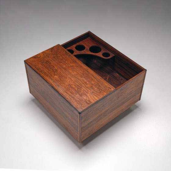 "Party Corner", hergestellt von Wards Ateljér AB, ist ein eindrucksvolles Beispiel für schwedisches Design aus der Mitte des Jahrhunderts. Bekannt für seine klaren Linien und funktionale Eleganz, verkörpert dieser Barschrank skandinavische Handwerkskunst mit hochwertigem Jacaranda-furniertem Schichtholz und schlichten Oberflächen. Das kompakte und dennoch geräumige Design bietet zahlreiche Aufbewahrungsmöglichkeiten für Flaschen, Gläser und Barutensilien und ist damit die perfekte Mischung aus Stil und Zweckmäßigkeit für die Bewirtung von Gesellschaften. Die minimalistische Ästhetik des Schranks spiegelt den modernistischen Einfluss der Zeit wider, bewahrt aber dennoch eine warme Atmosphäre.
