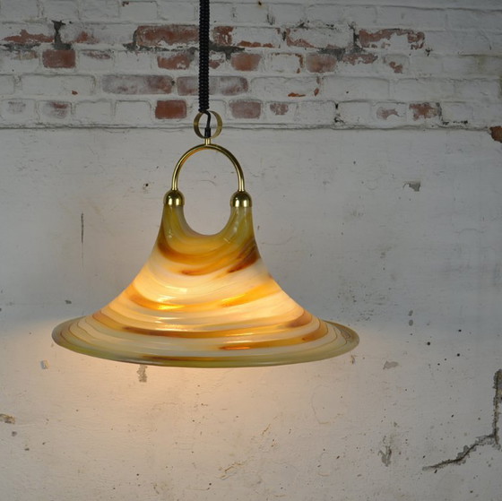 Einzigartige, schneckenförmige Pendelleuchte von Christallux aus den 1970er-Jahren. Die Leuchte vereint Orange- und Weißtöne mit einer eleganten Messingoberfläche. Perfekt für ein Interieur im Retro-Stil.