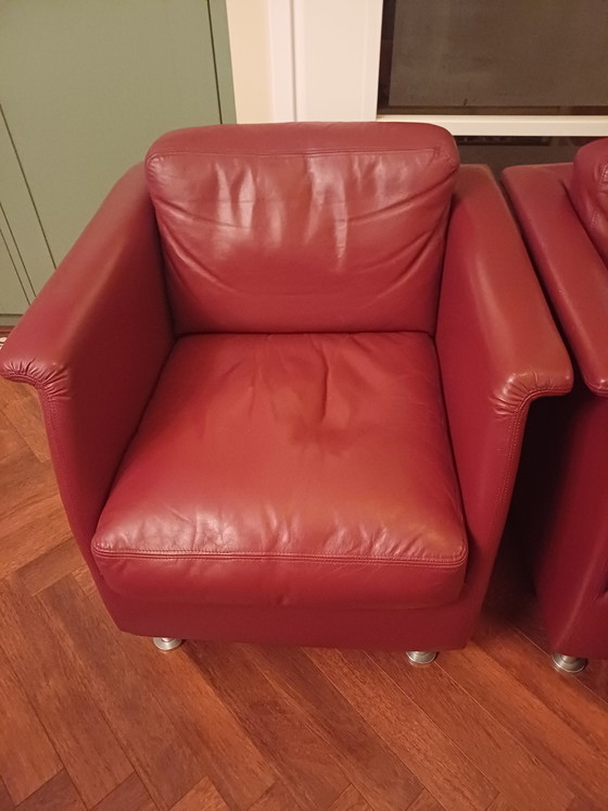 Entdecken Sie dieses stilvolle Set aus zwei Designer-Sesseln (vermutlich von Montis) in einem warmen Rotbraun. Perfekt für eine gemütliche Sitzecke oder als Blickfang in Ihrem Wohnzimmer. Die Sessel sind mit hochwertigem Leder bezogen, das nicht nur strapazierfähig ist, sondern auch luxuriös wirkt.
