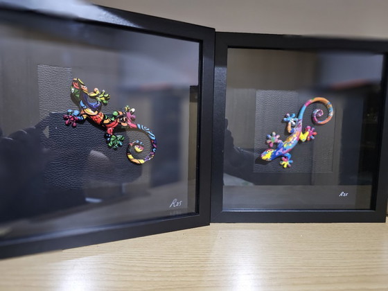Diese beiden bezaubernden, handgefertigten Gemälde zeigen Glücksgeckos und wurden mit viel Liebe zum Detail gestaltet. Jedes Stück ist ein Unikat, und die Lederakzente verleihen ihm Eleganz und Raffinesse. Die leuchtenden Farben und das unkonventionelle Design machen diese Gemälde zur perfekten Ergänzung für jeden Raum und bringen Glück und Stil.